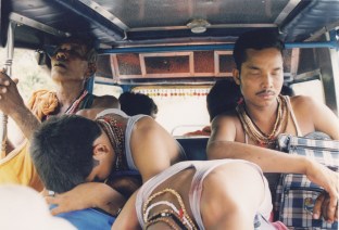Michael (email 29 Aug 02 titled “Just another day in India”): On a bus to Rishikesh, on my one day off from a yoga course taught by a saintly old swami who was a colonel in the Indian army for 20 years . . . training commandos no less. As I wipe the sleep from my eyes and massage my yoga punished limbs it doesn’t surprise me as much as when he first told me. I’m travelling past cows that compete with beggars for food in stinking piles of fly-blown garbage . . . straight-backed women in bright saris carrying impossibly large sacks of flour on their heads, mangey hairless street dogs who fight and rip the shit out of each other, pigs wallowing in swollen gutters full of green black slime . . . and all the while motorscooters swarm like termites on the way back to the nest before a storm. Suddenly the bus starts making a noise like a spanner dropped in a blender, and it comes to a grinding halt. “Shit” says the dude next to me. We’re stopped next to a sort of shaded clearing with a water pump. There are 4 girls wearing saris while washing clothes as one pumps the water.