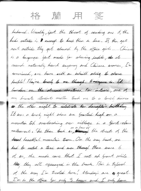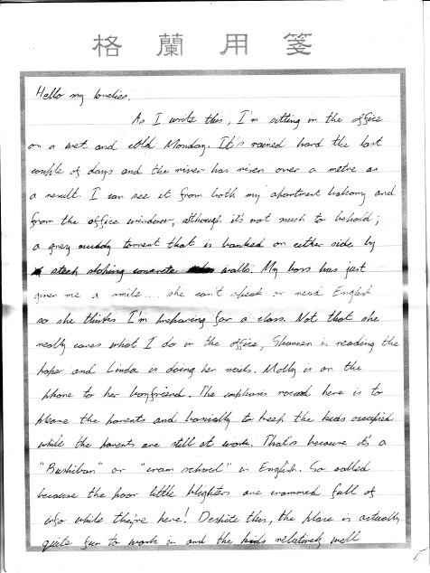 Michael (email 7 Mar 02): . . . Well…..been here about 4 months now. Doesn’t seem like its been that long, then again some days I feel like I been here for years. Still doing me yoga most mornings and I try to get to the local pool 3 times a week to swim laps (lookin sexy in the old speedos and bathing cap…lock up ya daughters) but haven’t been playing the piano like I was when I first got here. Ive been lucky I gotta admit. I pretty much grabbed the first job i was offered here and it turned out to be el primo cruisyoso. My main job is in the arvos teaching at an after school cram school for kids….I’ve come to the conclusion that I’m there pretty much “for display purposes only” and I think my boss likes to keep me where all can behold the glory of the white foreign teacher rather than have me teaching (god forbid!) where only the students would benefit. The lessons I do teach are fuckin great as I always play games and just have fun with the little tykes and generally act like a dickhead. I teach pretty much whatever I want and no one seems to care. I do though, funnily enough. Most of the time there, I just work on my Chinese, harass the office girls, read the paper for an hour or 2 and lately I’ve even started on “War and Peace”, (great book, I highly recommend it). My boss loves me, I love her and the co-workers are cool. Sometimes i have to check to see if my balls are still attached……fuckin Hello Kitty is everywhere dude. I also teach at a kindergarten (owned by the same boss) for 4 hours a week and I love that fuckin job man I really do, the little psychos have learned so much already. They’ll be debating the finer points of Shakespearean tragedy by the time I get outta here if they keep going at this rate. I’ve even started teaching yoga to the kids and teachers at the kindergarten every morning! (Have you ever seen a 2 year old doing Salute to the Sun? Fuckin hilarious.) My apartment is on the top floor of the same building and I’ve got it free of rent for however long I work here. Been saving a shitload of cash…should have about 12 thou when I leave in 3 months!