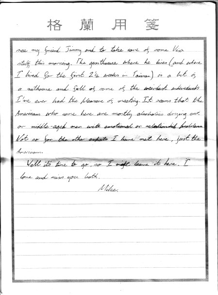 Dearest mother, I haven’t forgotten that it’s your birthday on Sunday, and hopefully the postman should be delivering that 12 foot jade buddha statue any time soon. Thank you once again, my dears, you really have brightened my day. Love, Mike.