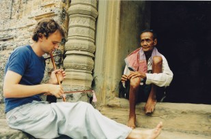 Peter (ceremony address, 15 Nov 02): Krissy and I were so lucky to have spent some time with Mike in Cambodia earlier this year. It was such a joyous reunion after a year apart, with the ruins of Angkor Wat providing an amazing backdrop. And he was still the big brother looking out for me. When I expressed a slight hesitation in piloting a clapped out old scooter through the chaotic streets of Siem Riep he said “No worries!” and piled me and Krissy on the back of his. I’m sure the locals are still laughing and shaking their heads at the sight of three large white folk weaving through the streets on a scooter designed for one small Cambodian.